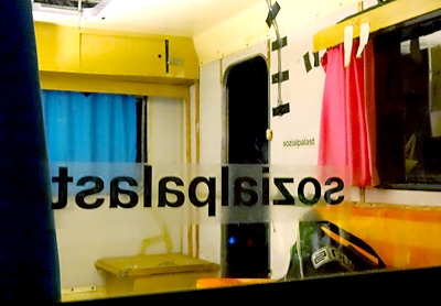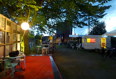 „Wir werden diesen Garten in einen Kunstraum verwandeln, wo Elemente aus 10 Jahren sozialpalast zum Einsatz kommen: Wohnwagen, Deckenlampen und U-Bahnschilder. Und die beiden Straßenplakatwände für Videoprojektionen sind auch schon wieder da!“